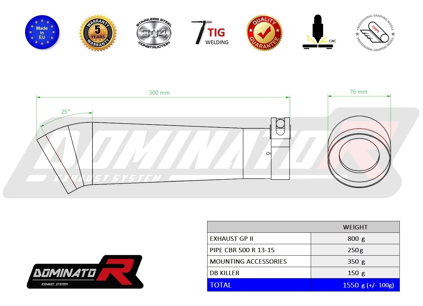 The Dominator Exhaust will change the nature of your motorcycle giving it a unique sound. The Exhaust system will increase the power and torque of the engine, while reducing the weight of the muffler.